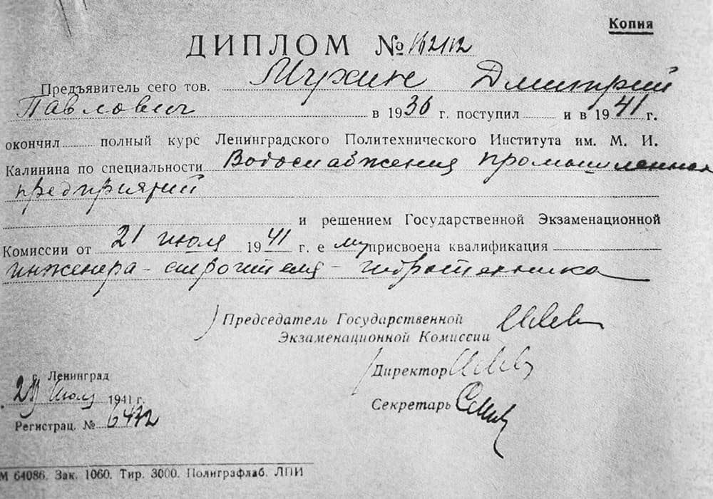 Дмитрий Павлович Мухин очень хотел учиться: экстерном сдал экзамены за полную среднюю школу, поступил на подготовительные курсы Политеха. Выпустился в 1941 году и почти сразу ушел на фронт. Дмитрий Мухин пробыл на войне два года: сгорел в танке в 25 лет.